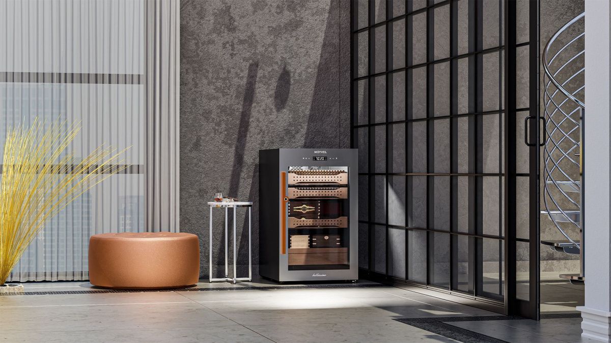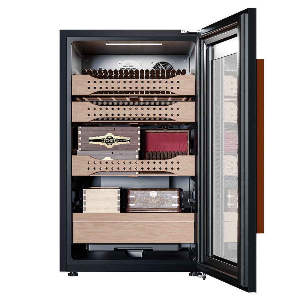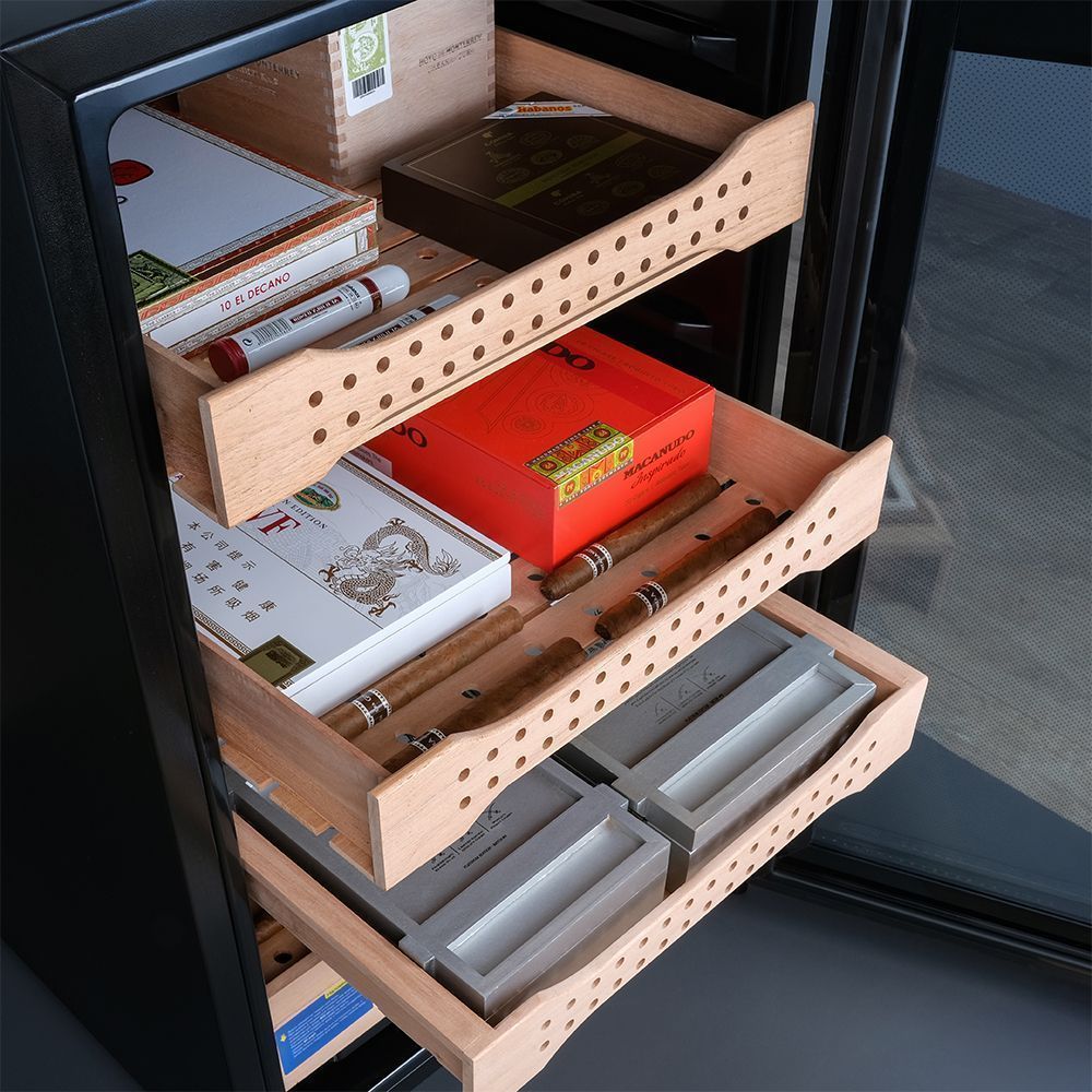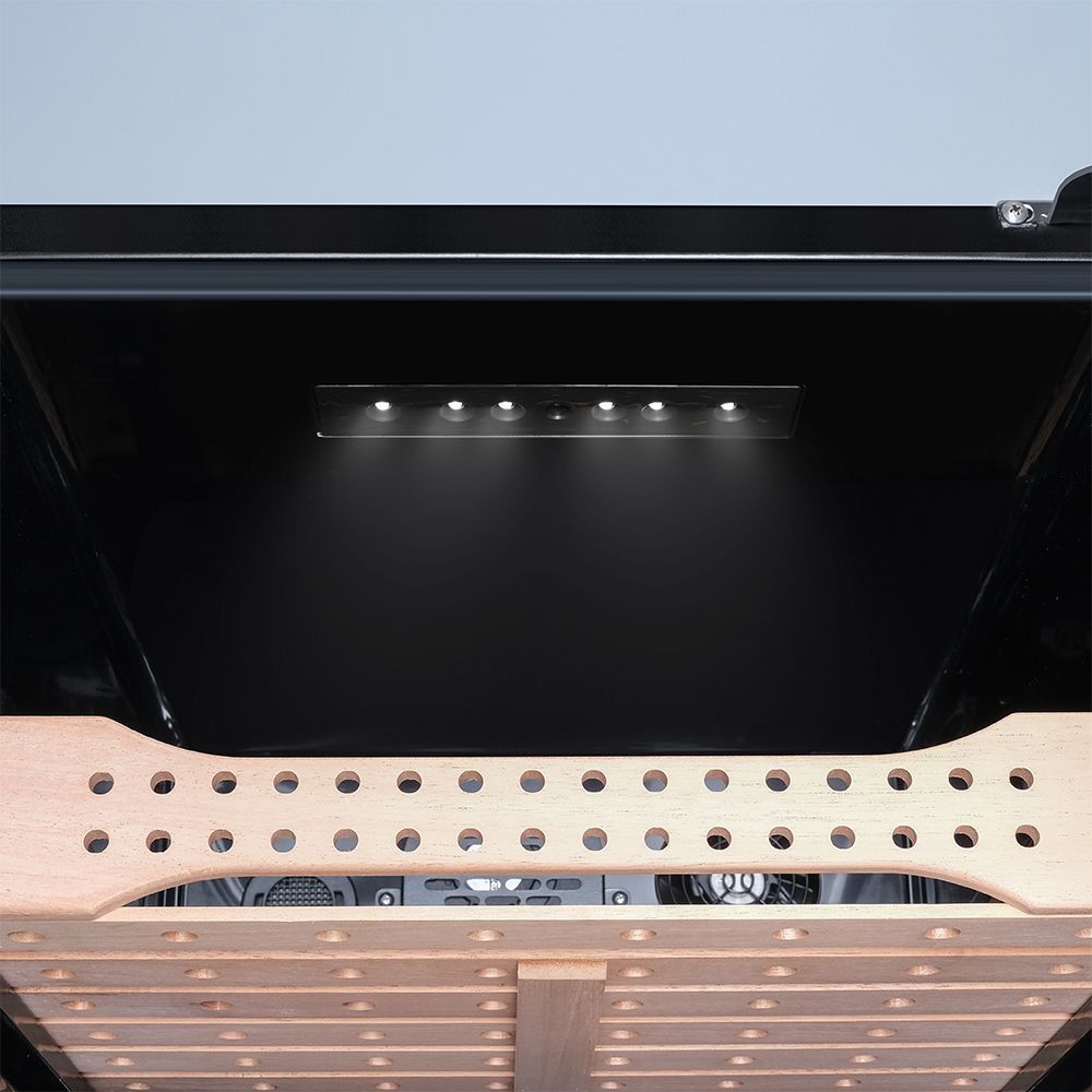 Особенность модели — точный температурный контроль в диапазоне от +16 до +22°C и уровень влажности 60-75%, что позволяет поддерживать оптимальные условия для хранения и бережного созревания табачных изделий. Внутренняя подсветка и встроенный гигрометр упрощают мониторинг состояния коллекции.