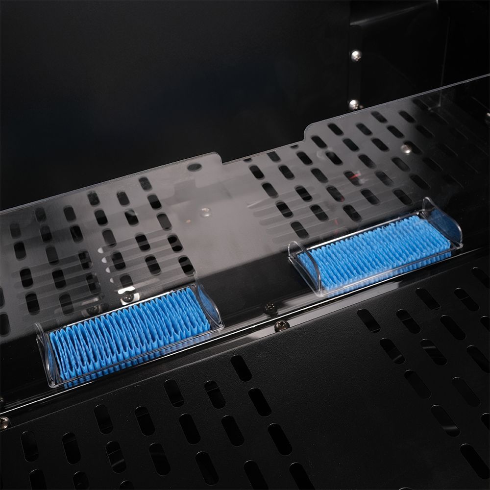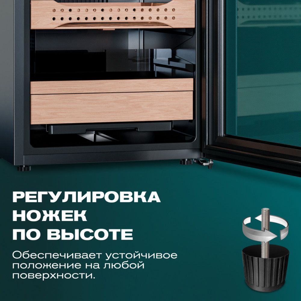 Управляется хьюмидор с помощью сенсорной панели, а дверь, оснащенная магнитным уплотнителем, открывается с помощью отпечатка пальца, обеспечивая защиту содержимого. Хьюмидор устойчиво будет стоять на любой поверхности, благодаря регулируемым ножкам.