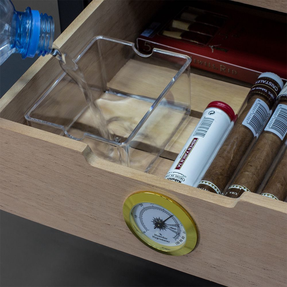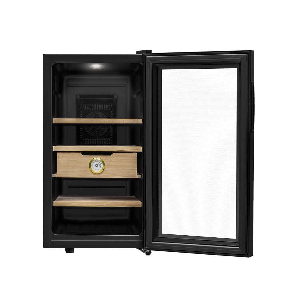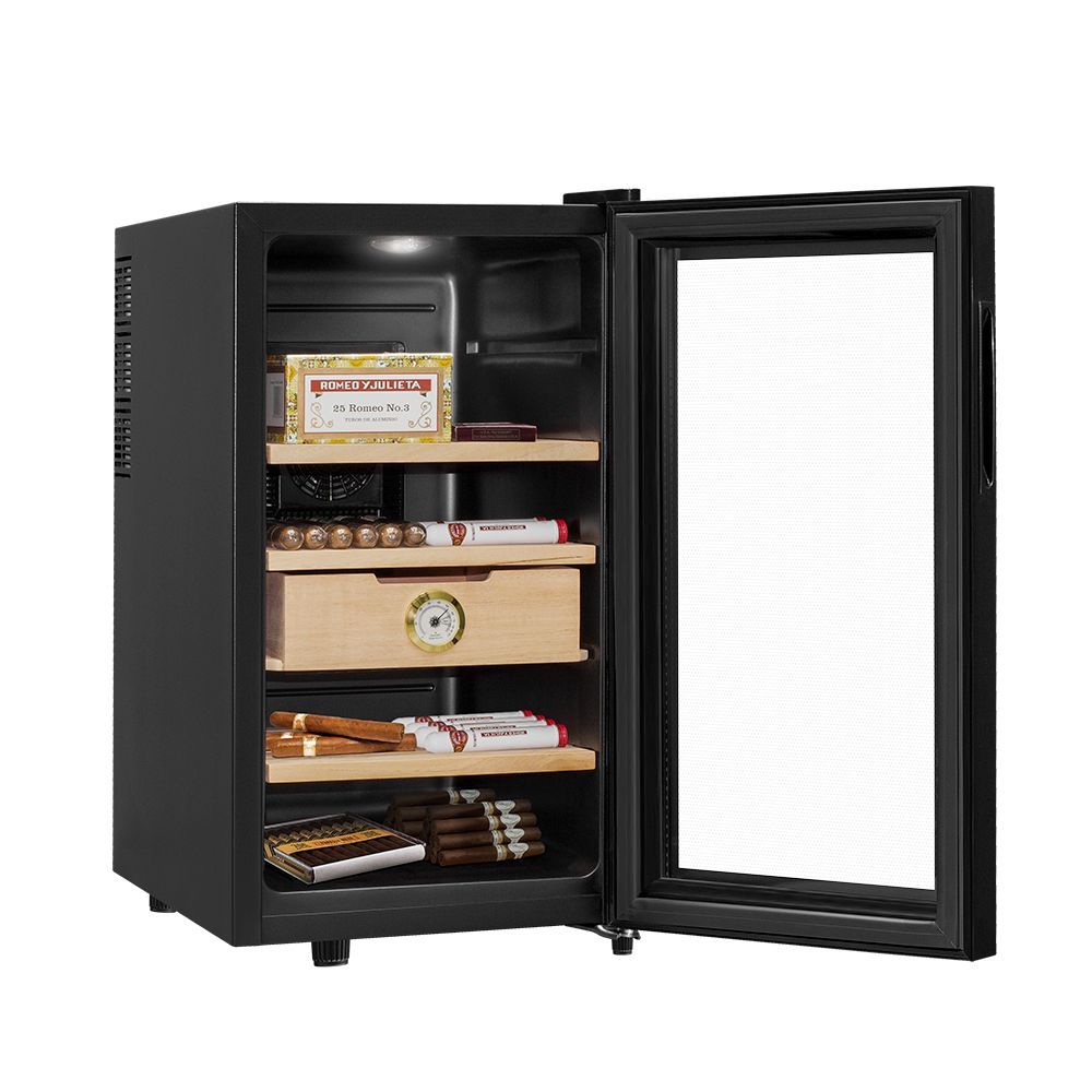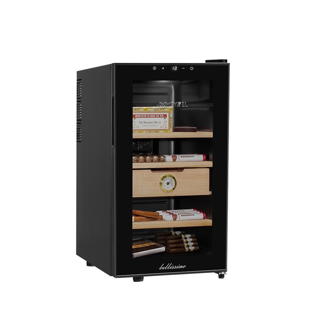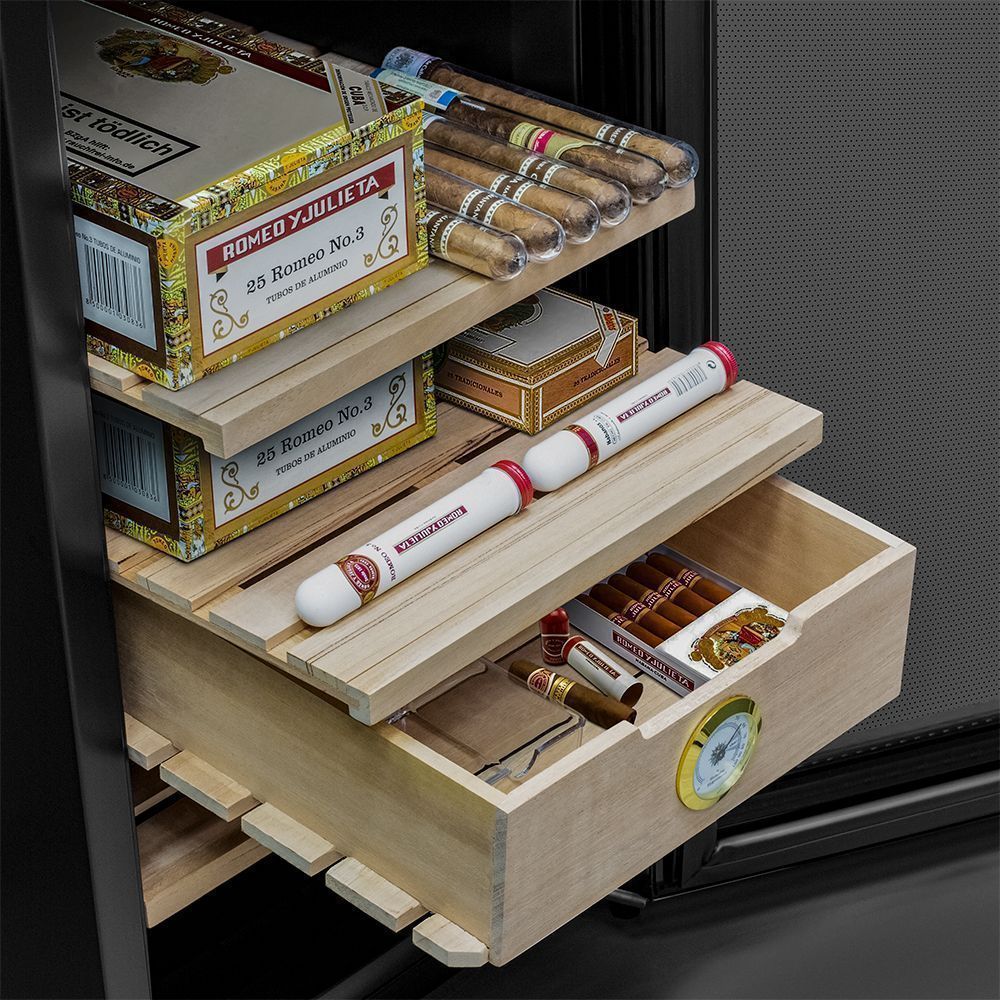 Если вы любитель сигар, то хорошо знаете, как важно хранить сигары в оптимальных условиях влажности. Хьюмидор Meyvel MC-48BT отлично подойдёт для этой задачи. Стильный дизайн будет лаконично смотреться с любым интерьером. При небольших размера объём составляет 48 литра и позволяет хранить большую коллекцию сигар. В комплекте идут 3 полки и выдвижной ящик, которые можно располагать на разных уровнях. Полки и ящик изготовлены из дерева испанского кедра - отлично подходят для поддержания оптимального уровня влажности и не портятся во время эксплуатации. Дверца с двойным стеклом имеет защиту от УФ лучей и не пропускает излишнего излучения.